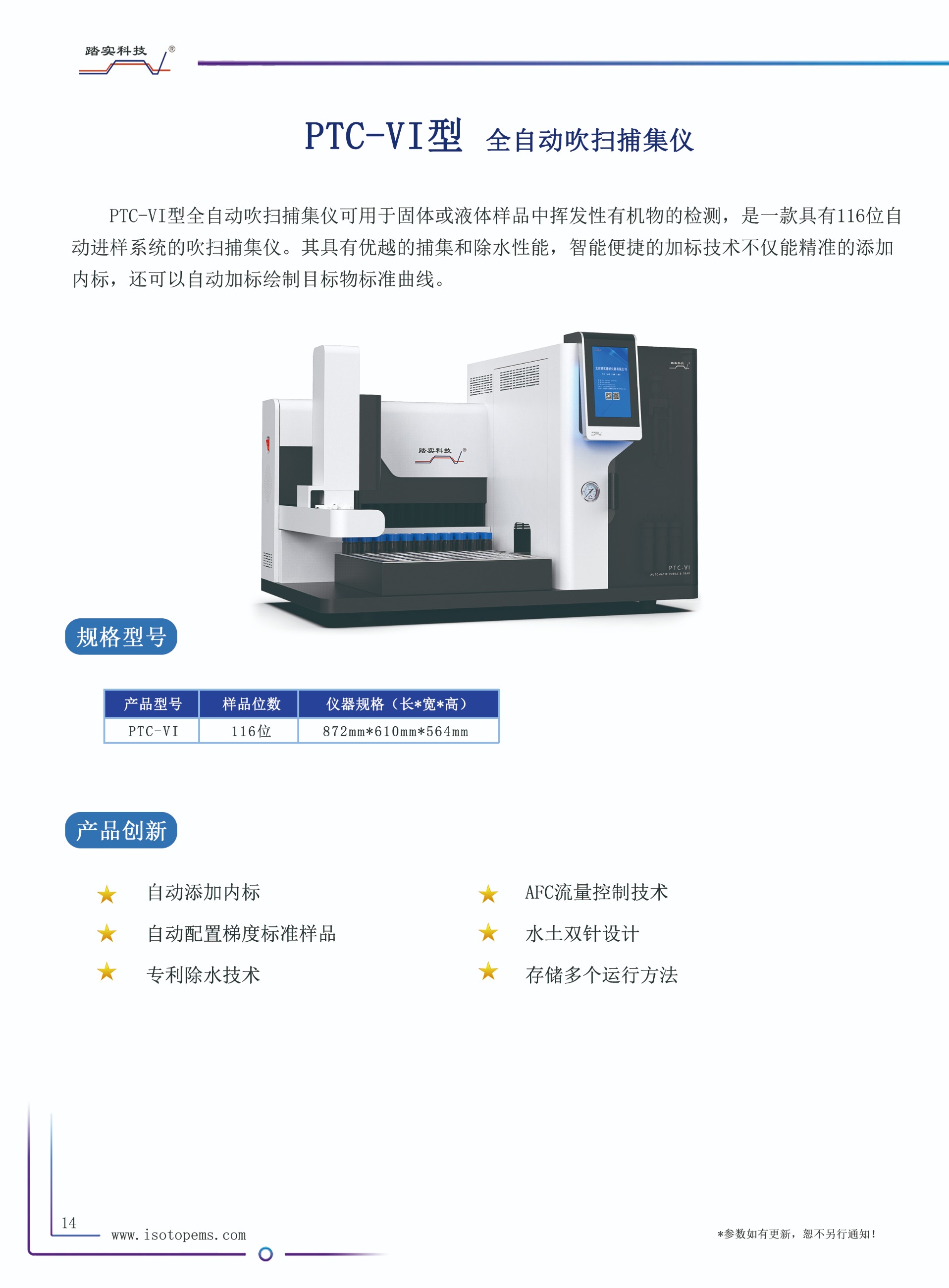 PTC-VI型全自動(dòng)吹掃捕集儀可用于固體或液體樣品中揮發(fā)性有機(jī)物的檢測,是一款具有116位自動(dòng)進(jìn)樣系統(tǒng)的吹掃捕集儀。其具有優(yōu)越的捕集和除水性能,智能便捷的加標(biāo)技術(shù)不僅能精準(zhǔn)的添加內(nèi)標(biāo),還可以自動(dòng)加標(biāo)繪制目標(biāo)物標(biāo)準(zhǔn)曲線。通過與GC或GC-MS的聯(lián)用,可以廣泛應(yīng)用于環(huán)境分析,如飲用水、廢水、土壤中的有機(jī)污染物分析,也可用于食品中揮發(fā)物(如氣味成分)的分析等。該款儀器符合《HJ639-2012水質(zhì) 揮發(fā)性有機(jī)物的測定 吹掃捕集/氣相色譜-質(zhì)譜法》、《HJ686-2014水質(zhì) 揮發(fā)性有機(jī)物的測定 吹掃捕集/氣相色譜-質(zhì)譜法》、《HJ605-2011土壤和沉積物揮發(fā)性有機(jī)物的測定 吹掃捕集/氣相色譜-質(zhì)譜法》等標(biāo)準(zhǔn)。